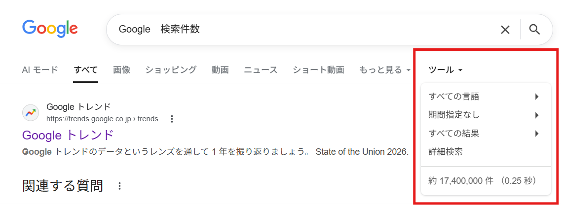 「あれ、Google検索で件数が表示されない?」と感じたユーザーは、まずPC表示での操作を確認してみましょう。Googleでキーワードを入力し検索結果を開いた後、画面下部のツールをクリックすると、上部にヒット数が再表示される場合があります。Google検索結果で件数が表示されない場合でも、この操作で数値が確認できるケースがあるため、初期の対策として有効です。
